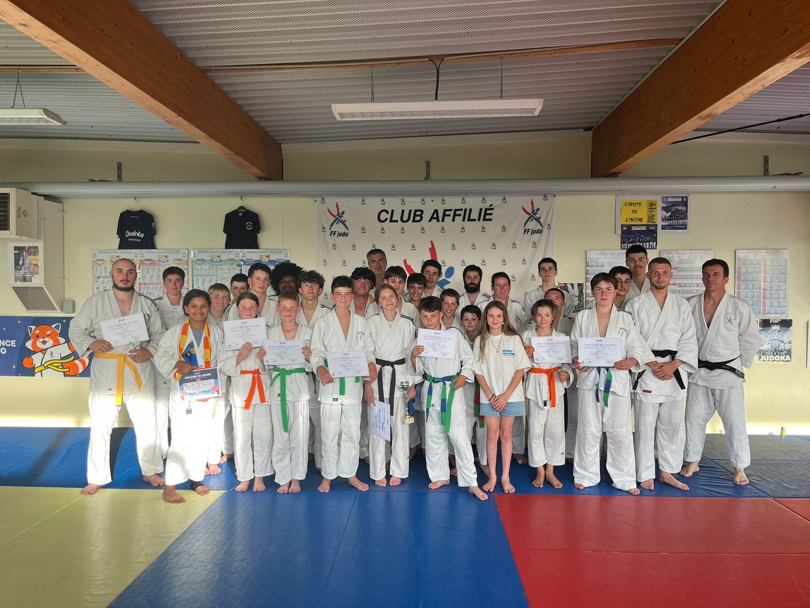 Ces dernières semaines les adhérents ont passé avec brio leurs tests. La remise des grades a donc débuté au JC Ardentes ! Ce soir, le cours adultes et celui des stars étaient réunis pour l’occasion. Les combattants ont reçu leur nouvelle ceinture, certains ont été distingués pour leurs performances et / ou leur attitude lors de cette saison, et nous avons terminé cette belle soirée autour d’un pot de l’amitié. C’était très sympa ! La suite des remises s’effectuera demain, pour les groupes de Audrey.